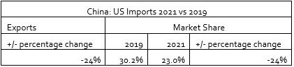 中国:现在有强有力的证据表明客户正在返回中国。截至 2021 年 8 月年初至今,从中国的进口与 2019 年同期相比下降了 35%,年初至今 9 月略有放缓至 32%。11 月份的最新数据显示,8 月份开始的复苏现在已经稳固到位。是的!年初至今的进口总量仍下降了 24%,但最近的数据非常积极。
