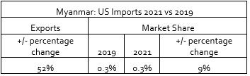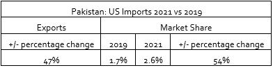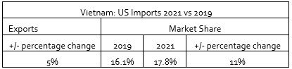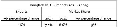 越南:这仍然是美国的第二大供应国。2021 年的结果参差不齐。9 月/10 月令人失望,而 8 月/11 月则非常好。综合考虑,越南仍然是仅次于中国的最重要供应国,其市场份额是排名第四的孟加拉国的两倍。