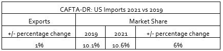 该表显示 CAFTA-DR 国家的市场份额适度增长。